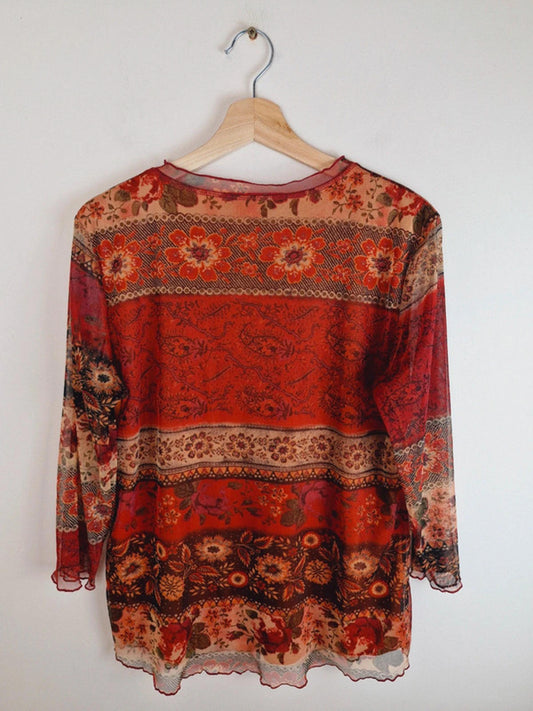 Womens Vintage y2k Boho Mesh Sleeve Top Red Orange L