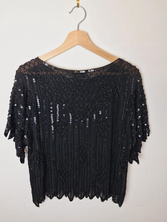 Womens Vintage Black Silk Sequin Beaded Top Blouse Festival M