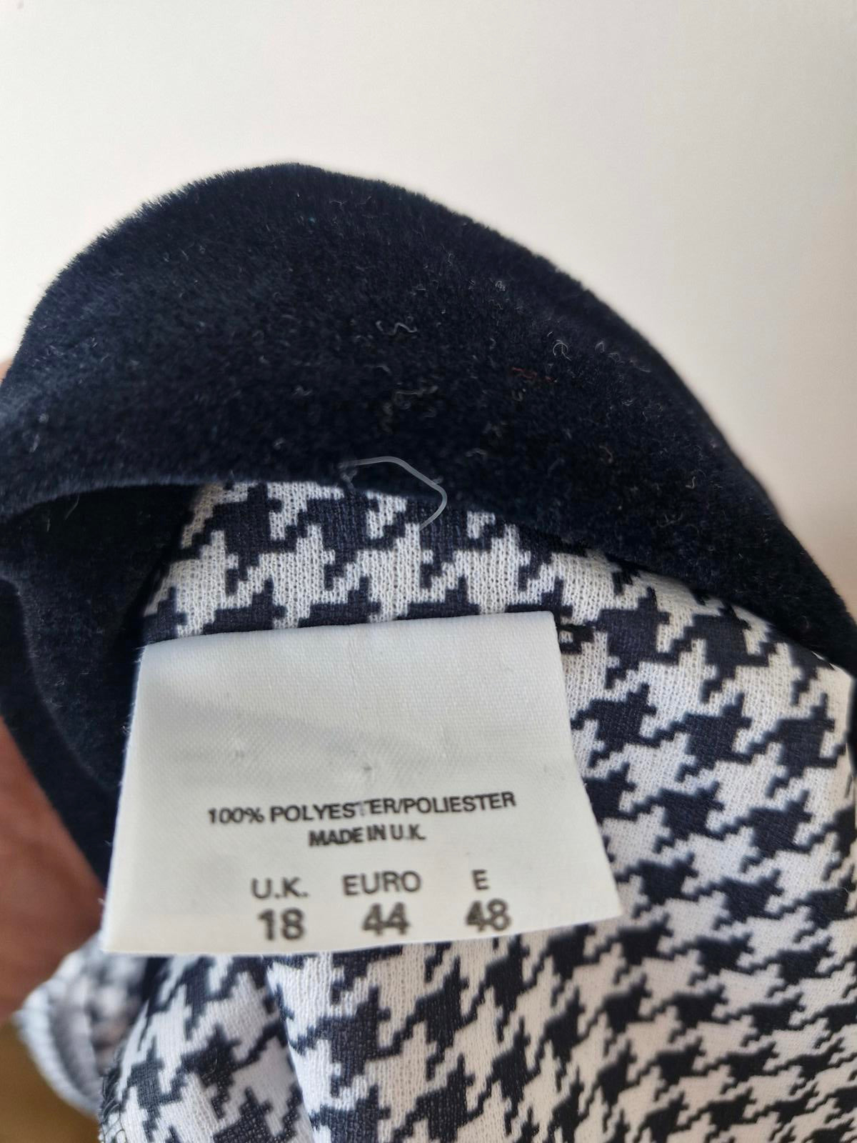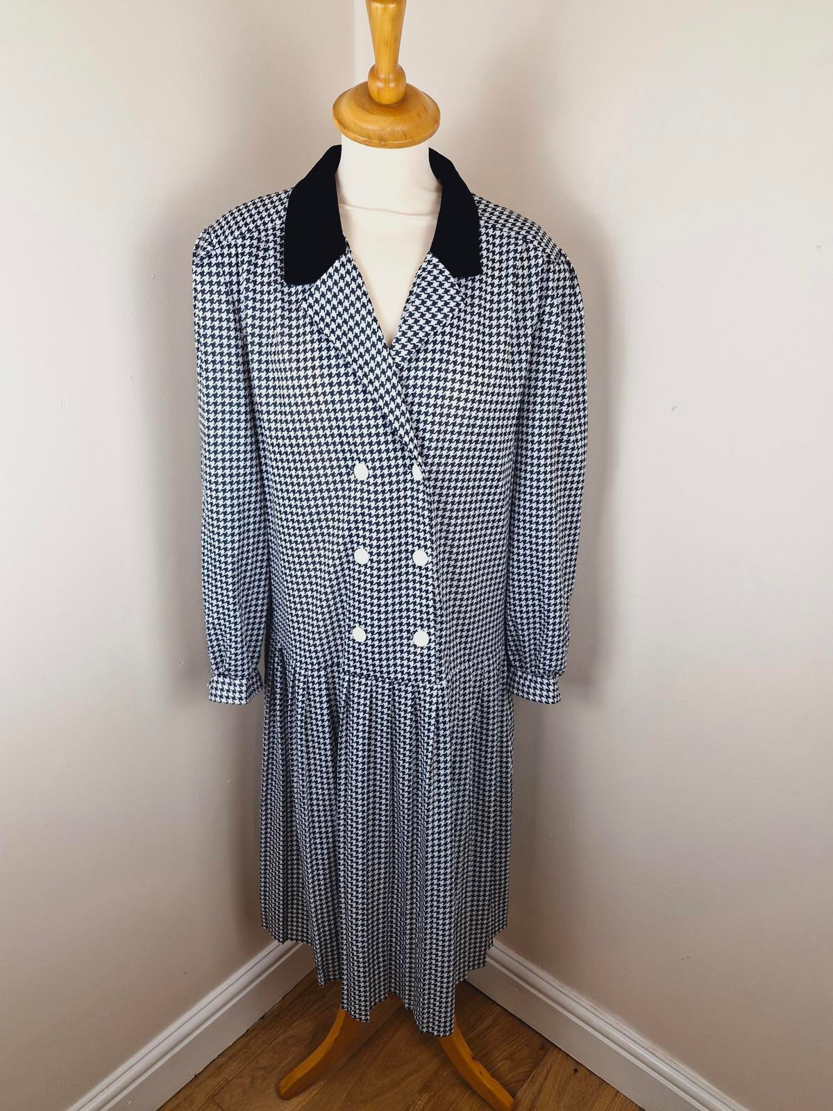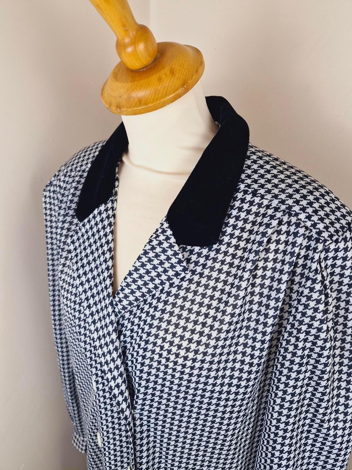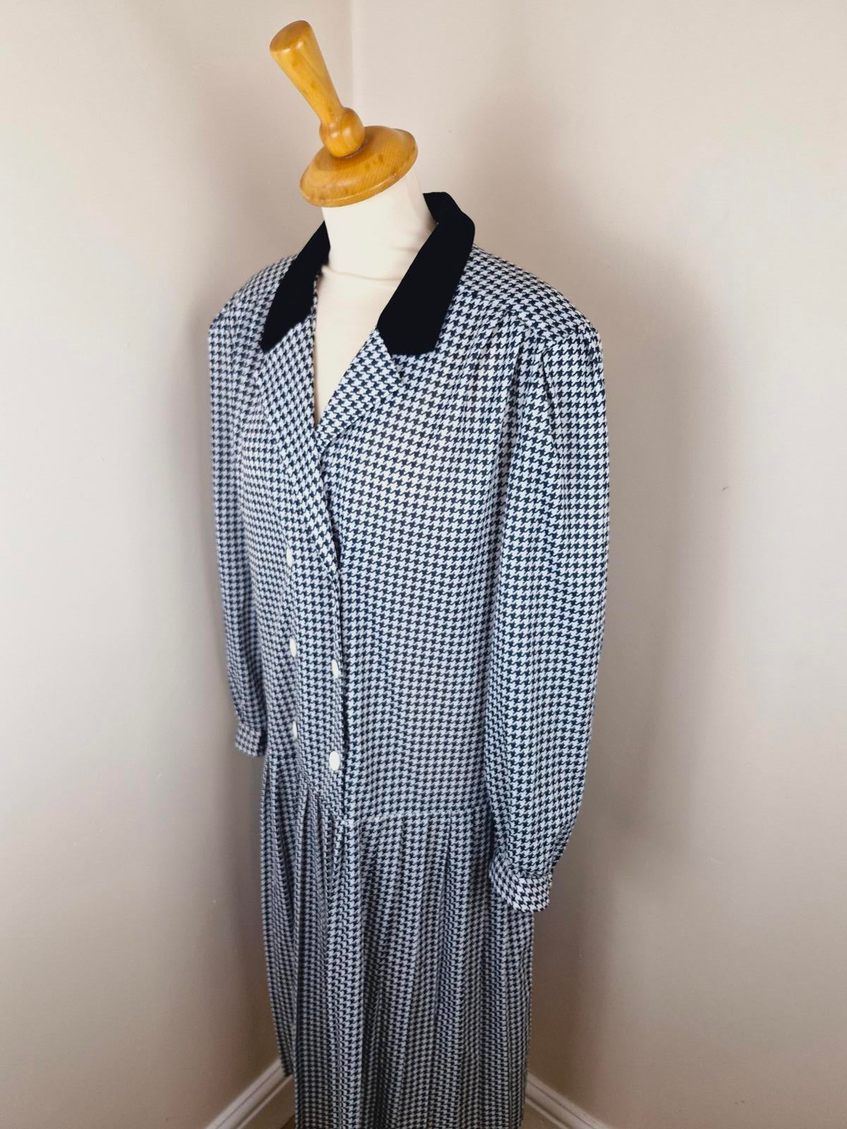 Vintage 80s Midi Long Dogtooth Black White Dress Velvet Shirtdress XL