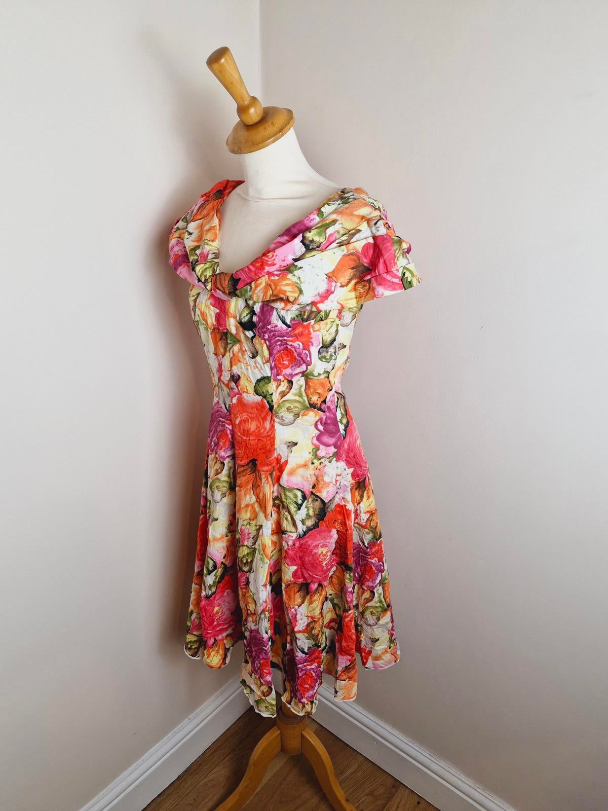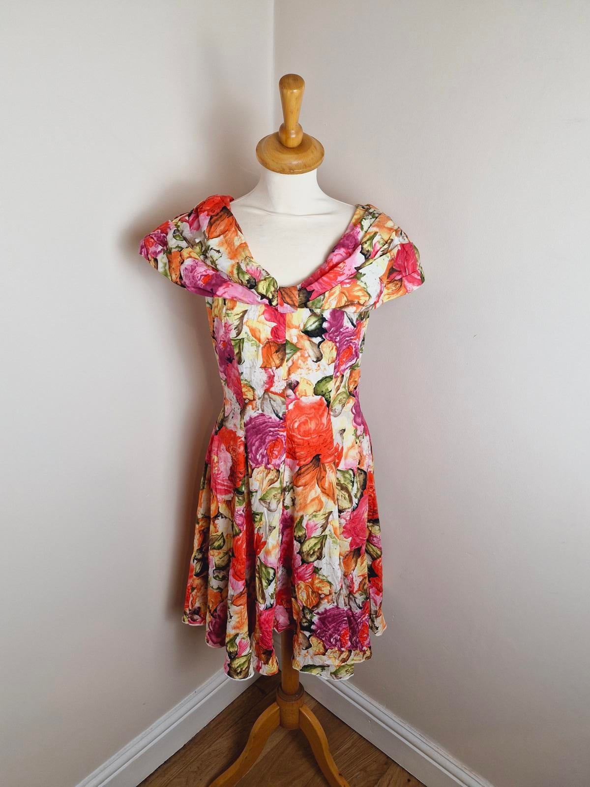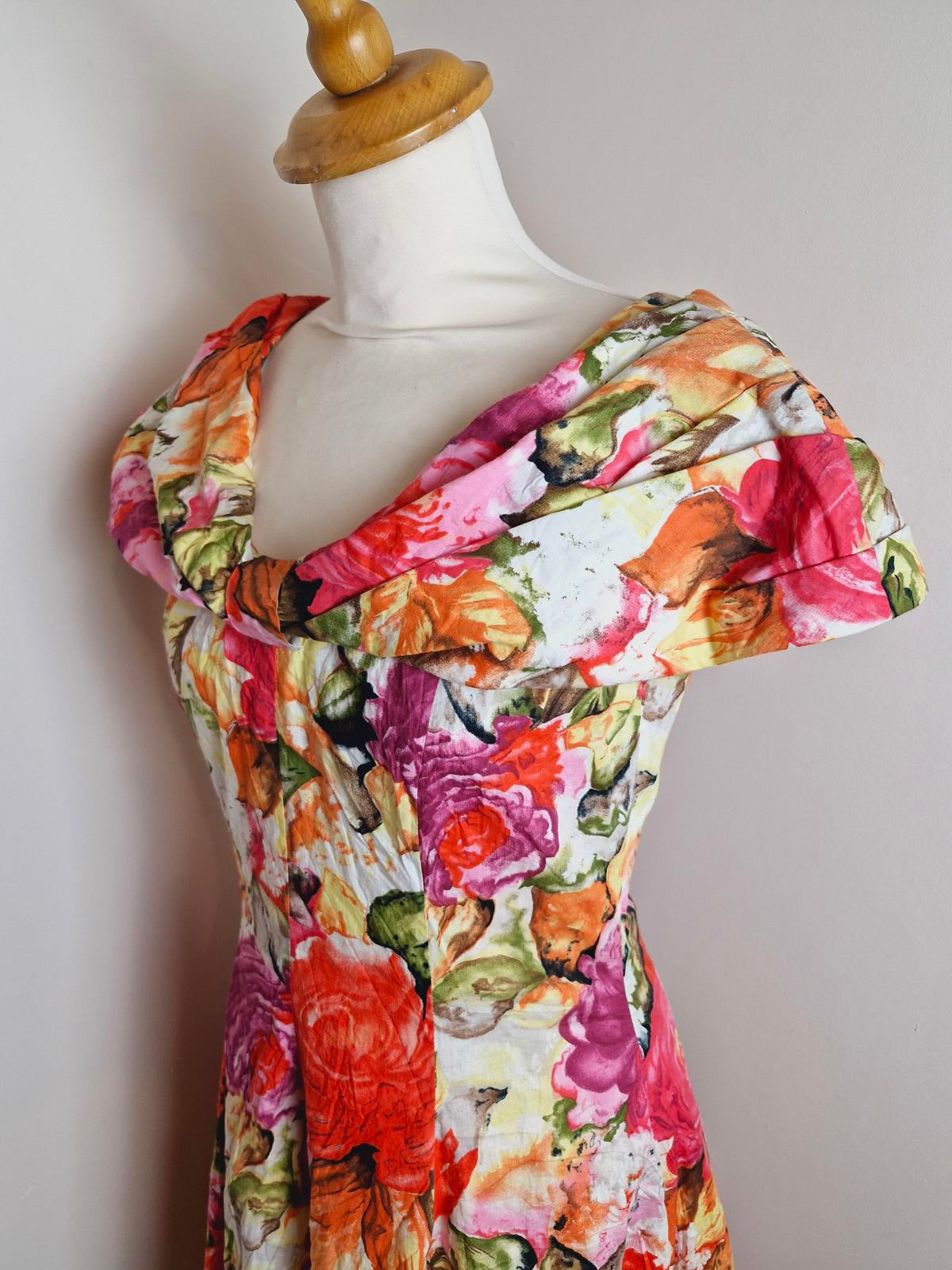 Vintage 80s summer dress retro Midi off shoulder bardot retro S UK8