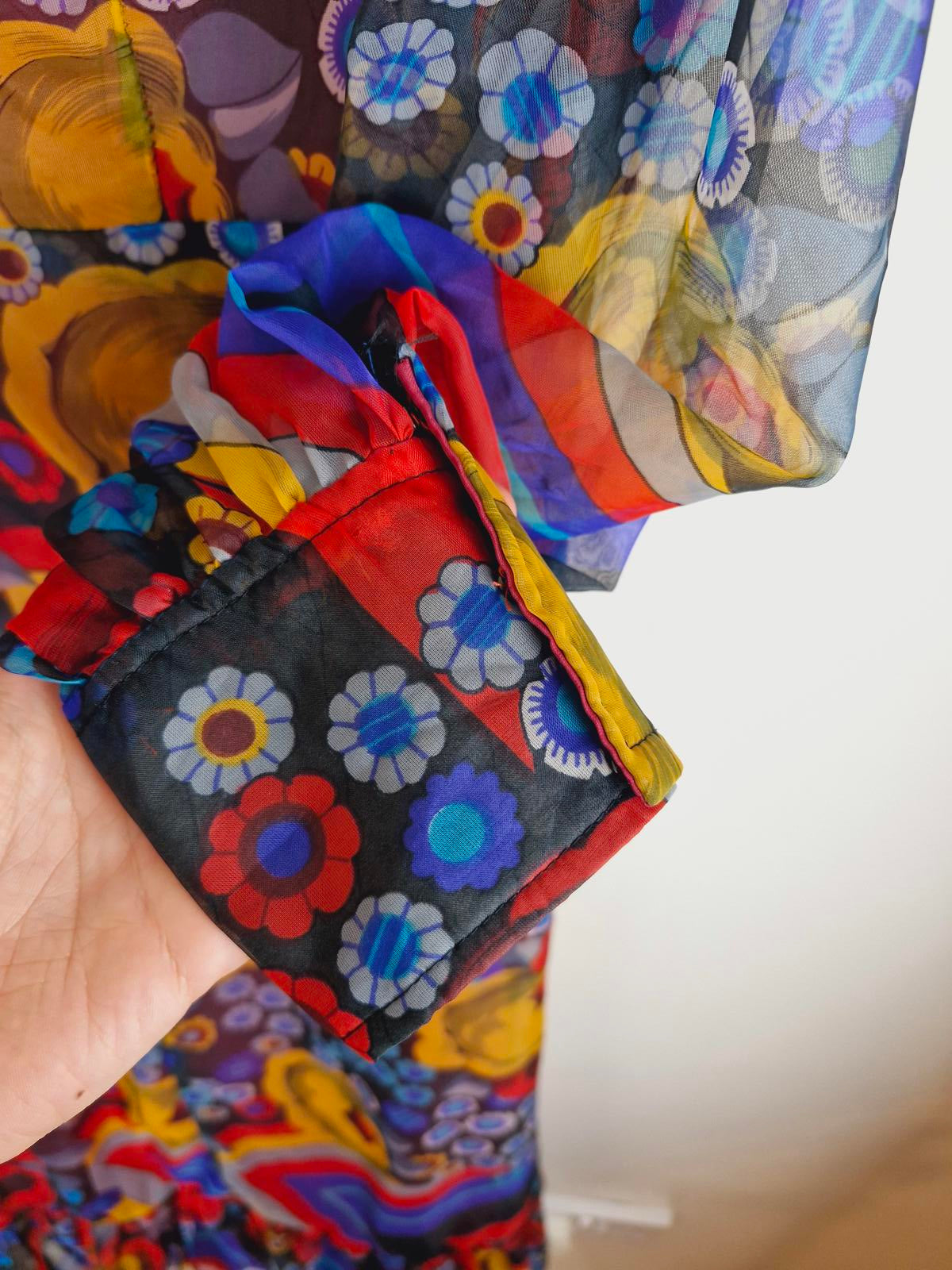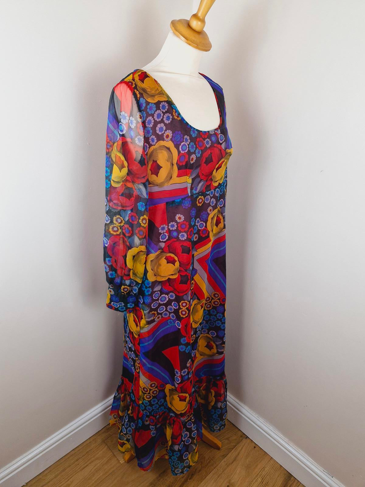 In good vintage condition - hem has come unfolded in a couple of areas on hem as shown. Beautiful sheer sleeves with poppers on cuffs. Such a unique 1970s handmade maxi dress - looks great belted too.