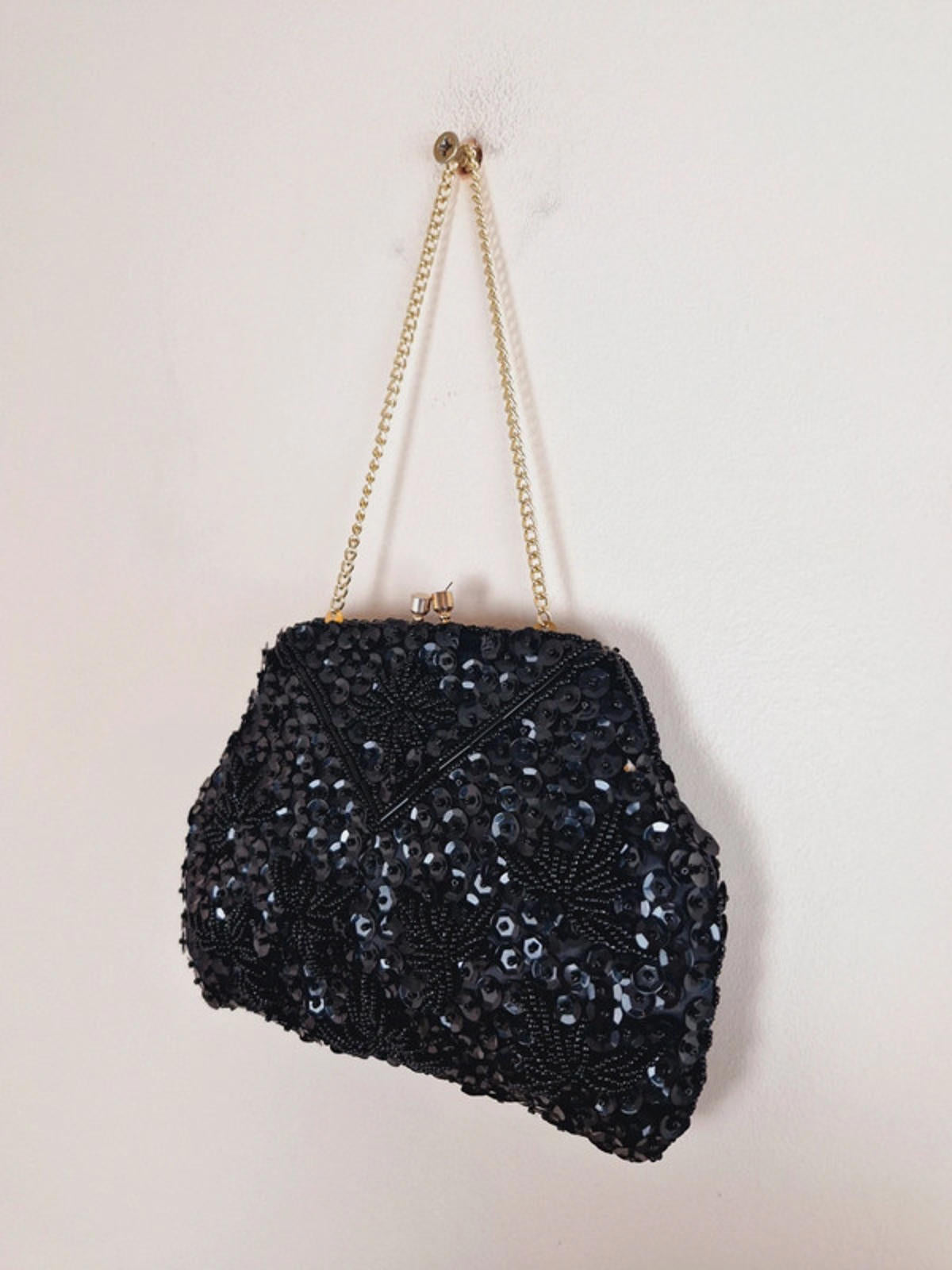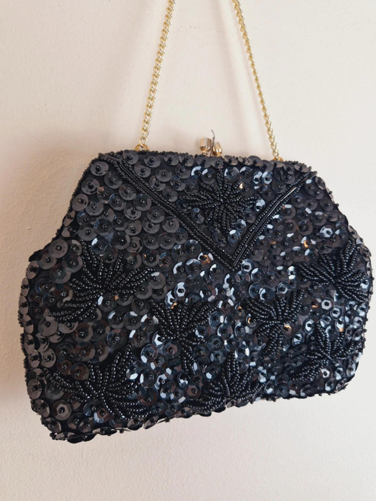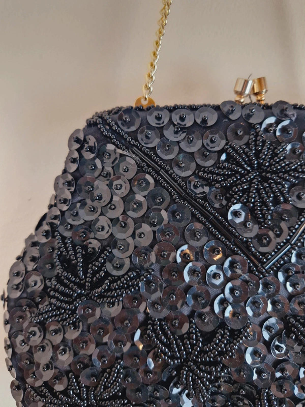 Womens Vintage Black Gold Beaded Sequin Bag Handbag