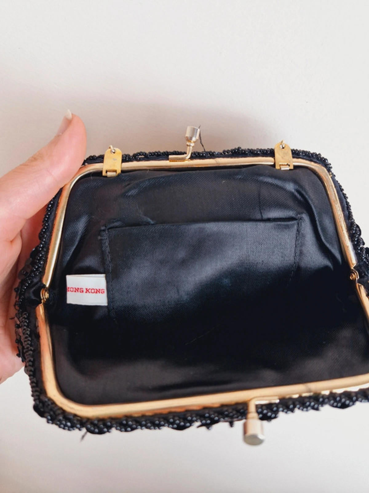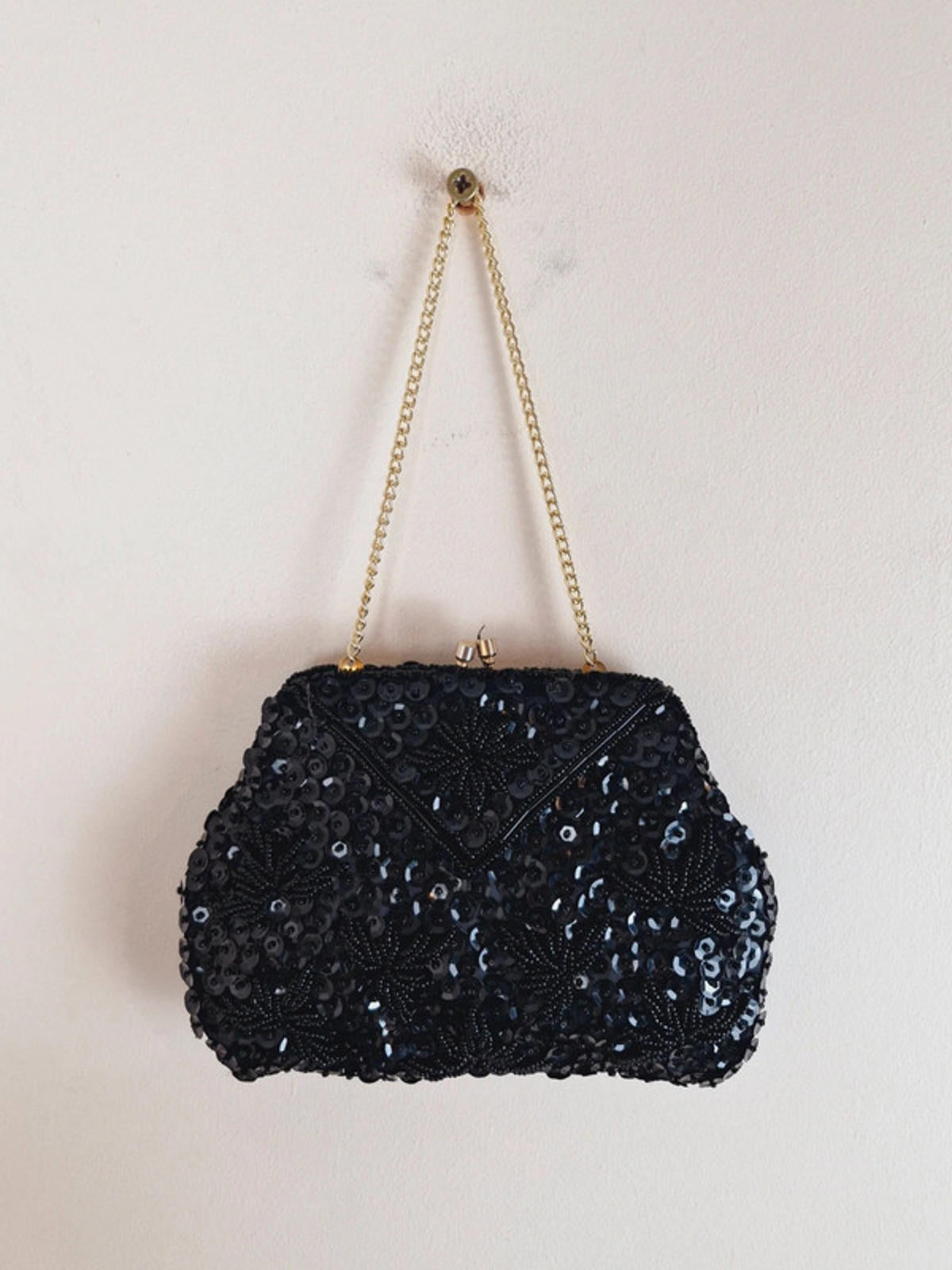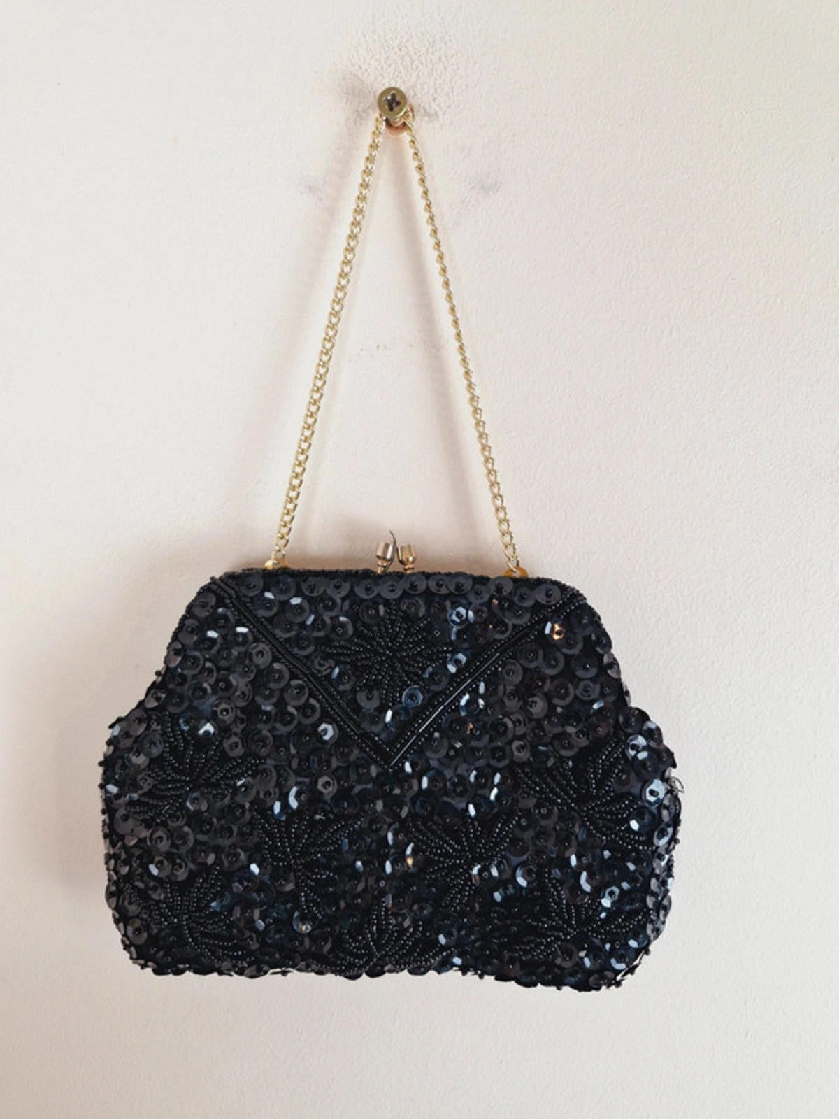 Womens Vintage Black Gold Beaded Sequin Bag Handbag