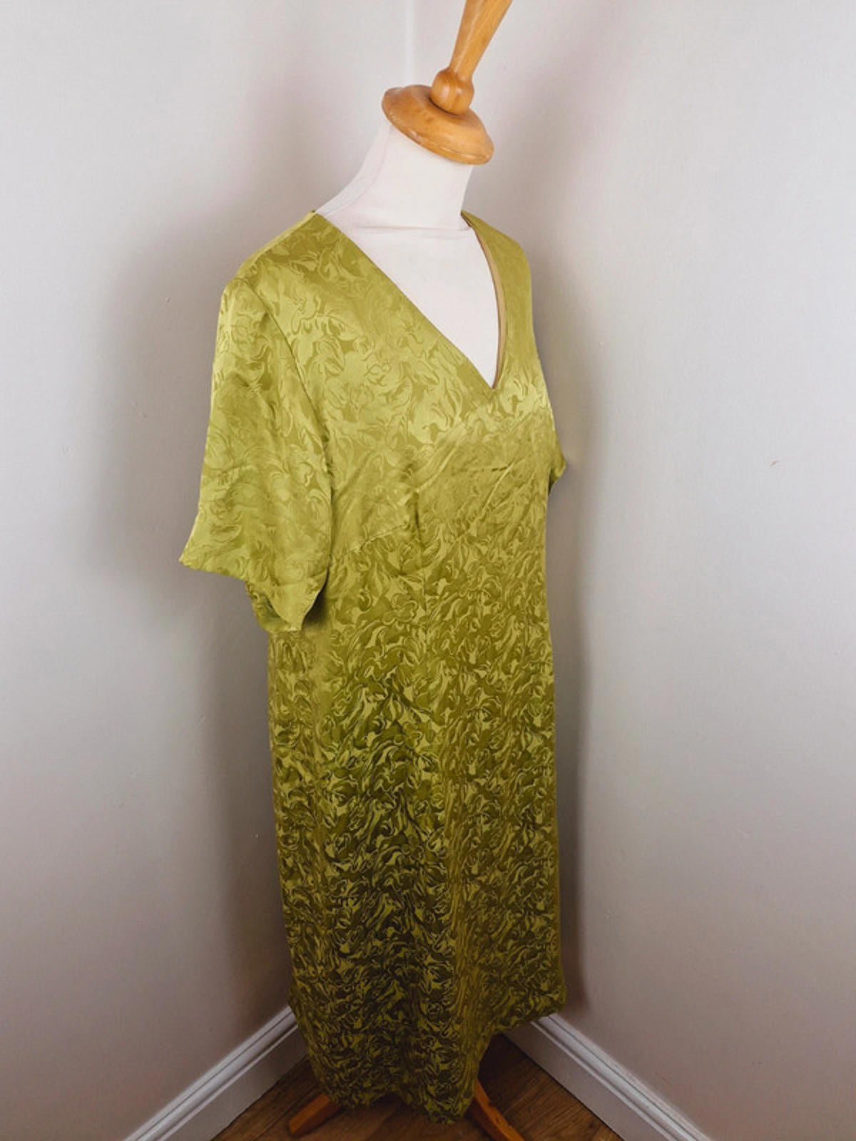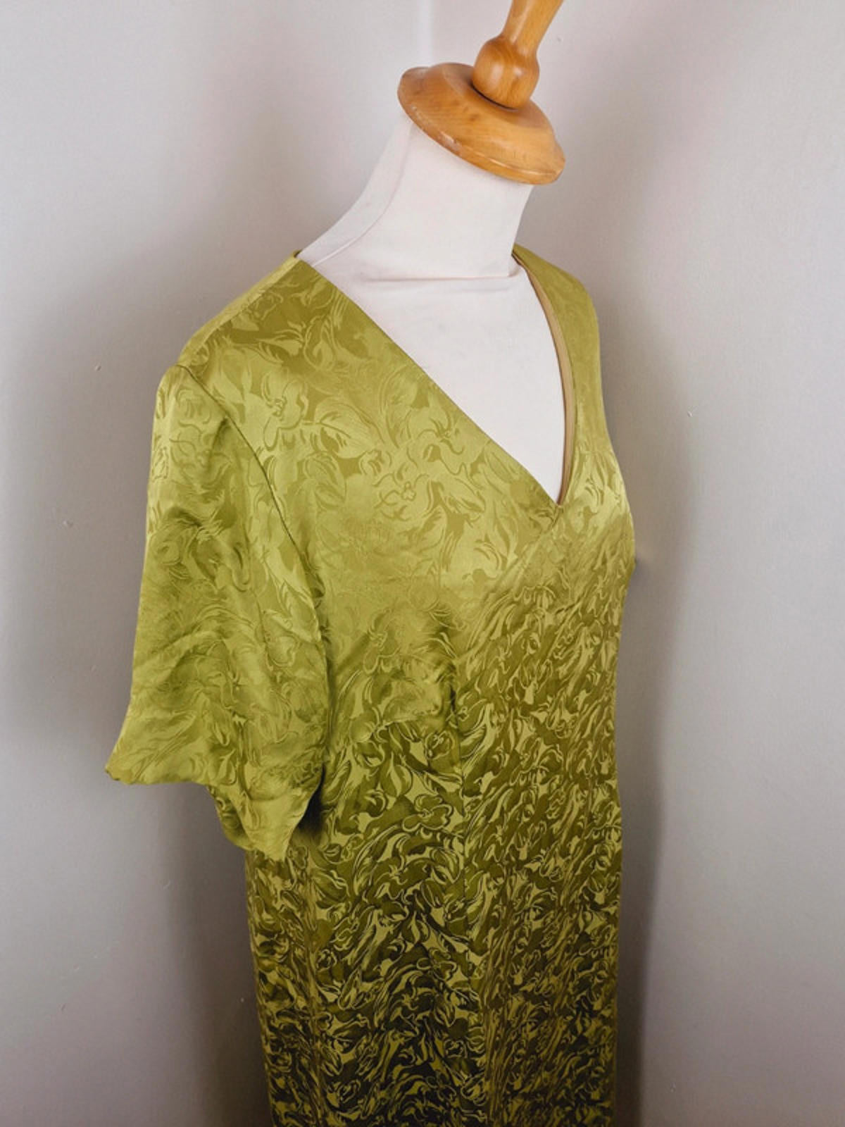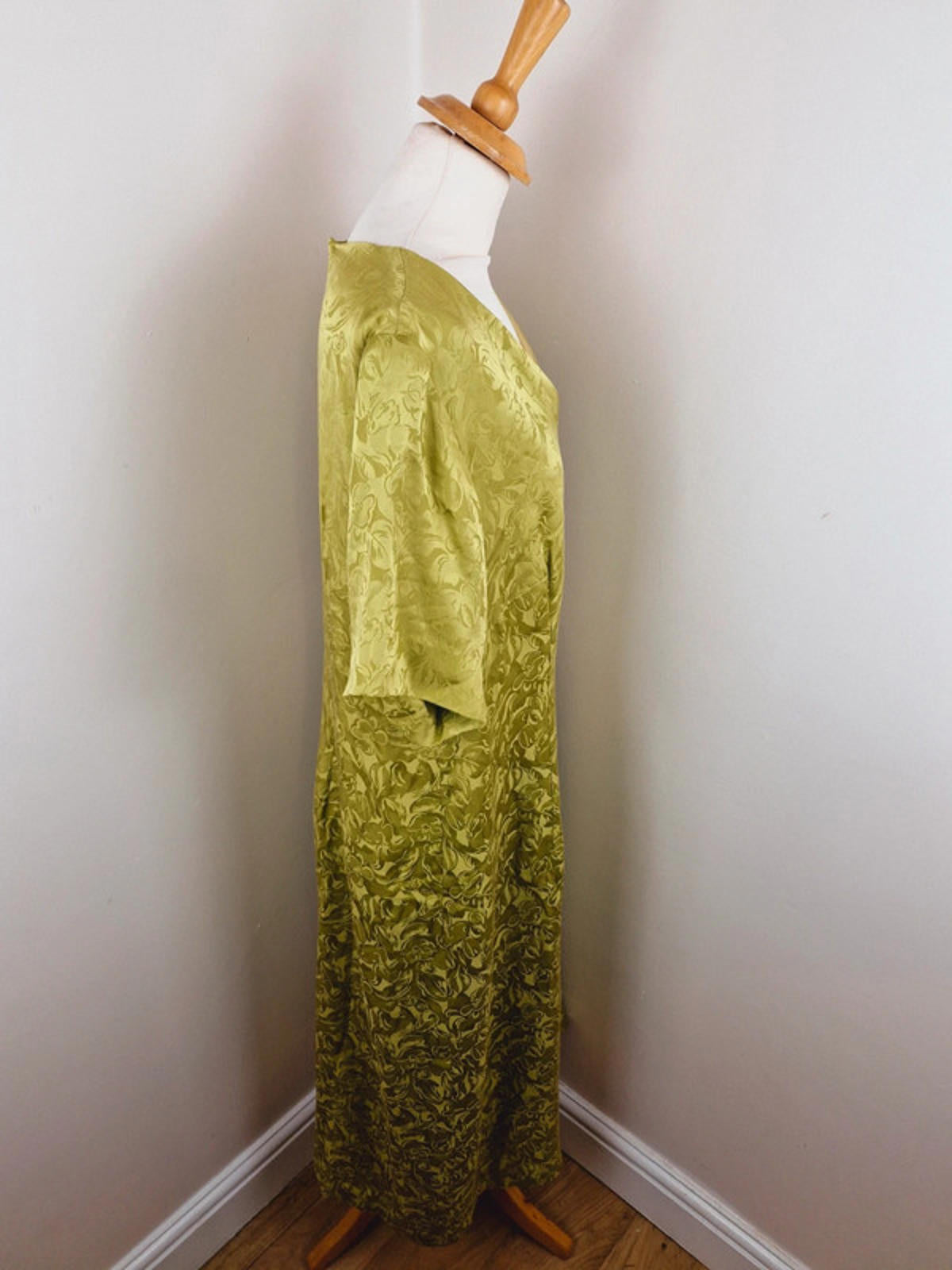 Womens Vintage green yellow Mustard satin long dress Midi Slip L