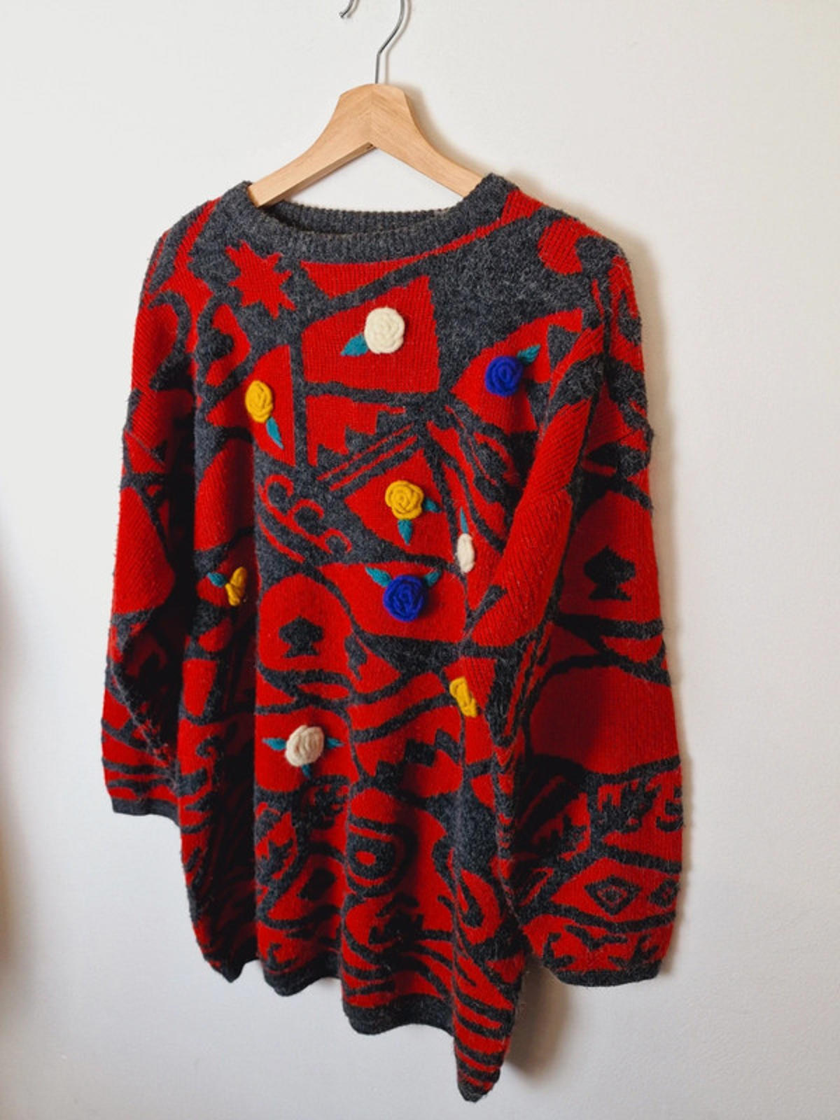 Womens Vintage Retro Red Floral Rose Funky Abstract Long Jumper Sweater Top L UK16